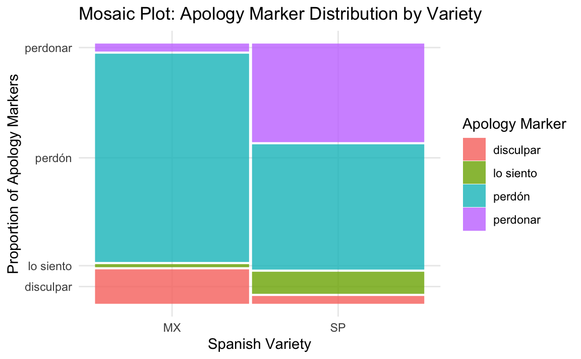 Beyond reproducing the numerical results, we also matched the study’s visualizations using bar plots (Figure 18.1) and mosaic plots (Figure 18.2), which clearly show how apology strategies vary by variety and face orientation. These visuals help to illustrate the claim that perdón has undergone grammaticalization—especially in Mexican Spanish into a high-frequency discourse marker used to manage politeness.
