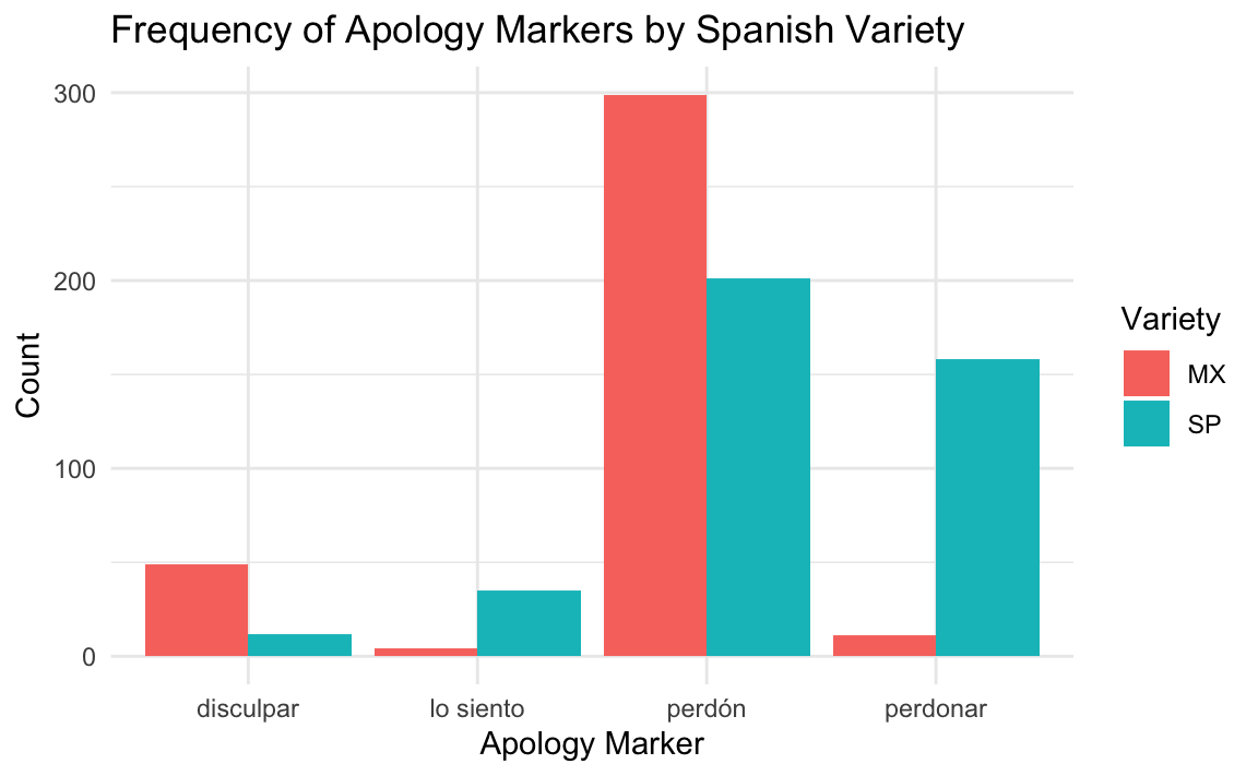 This project set out to reproduce the main findings of Jansegers, Melis & Arrington (2024), which explored the grammaticalization of perdón in Mexican and Peninsular Spanish. We were able to reproduce the findings of the original authors: in this corpus data, perdón is far more frequent in Mexican Spanish, while Peninsular Spanish speakers make use of a broader range of apology forms, including perdonar and lo siento. The frequency tables and percentage distributions that we reproduced from the author’s original data closely mirror those published in the original study.