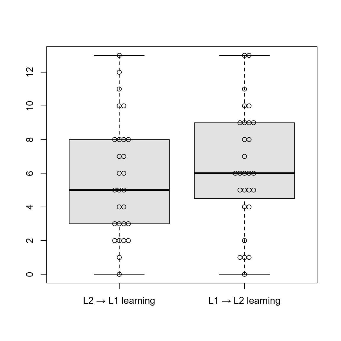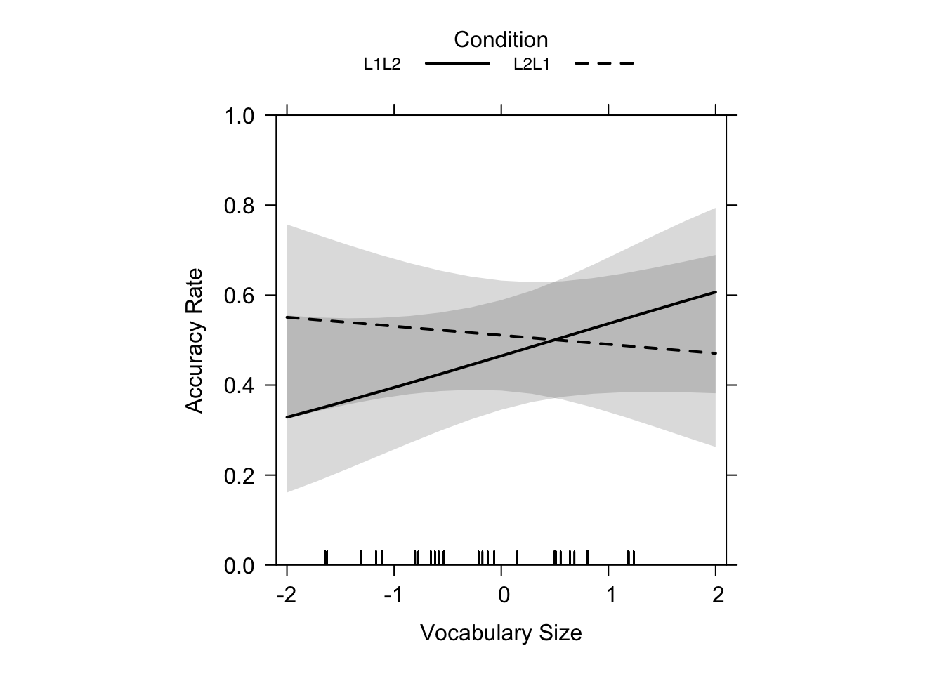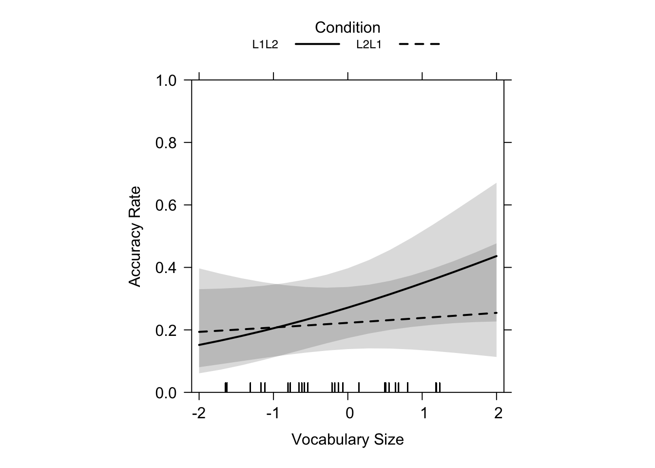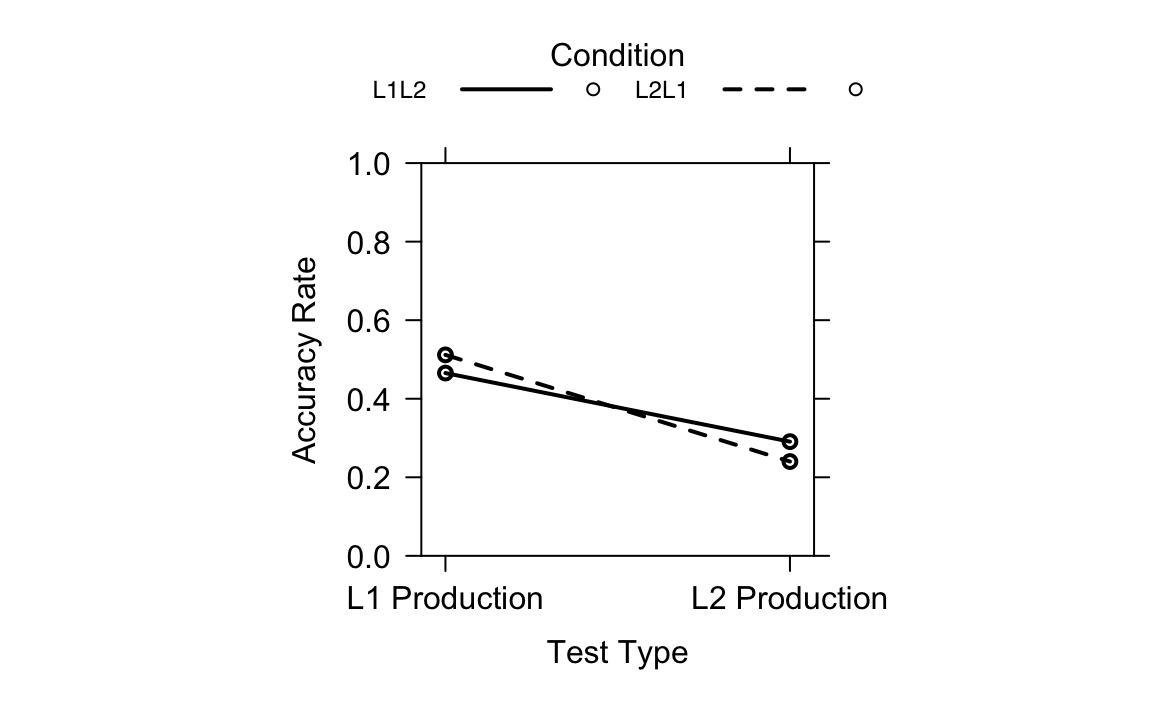 main = "", lty = c(1, 2), rescale.axis = F, ylim = c(0, 1), colors = "black", asp = 1)Just as the summary statistics of the model above suggested, Figure 19.7 shows that, while there was no significance of the results for learning direction or L2 proficiency, the trend bears similartiy to the results of our L1 production test (flatter L2 -> L1 slope, steeper L1 -> L2 slope). So, for lower-proficiency learners, L2 -> L1 leads to higher performance than L1 -> L2 learning. Furthermore, the authors explained that L2 -> L1 learning is much less influenced by L2 proficiency (Terai, Yamashita & Pasich 2021: 1128), which is clearly illustrated by the nearly flat dashed line in the graphs.