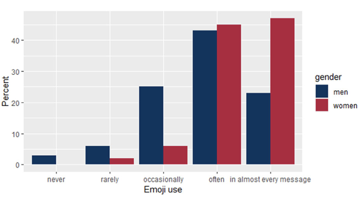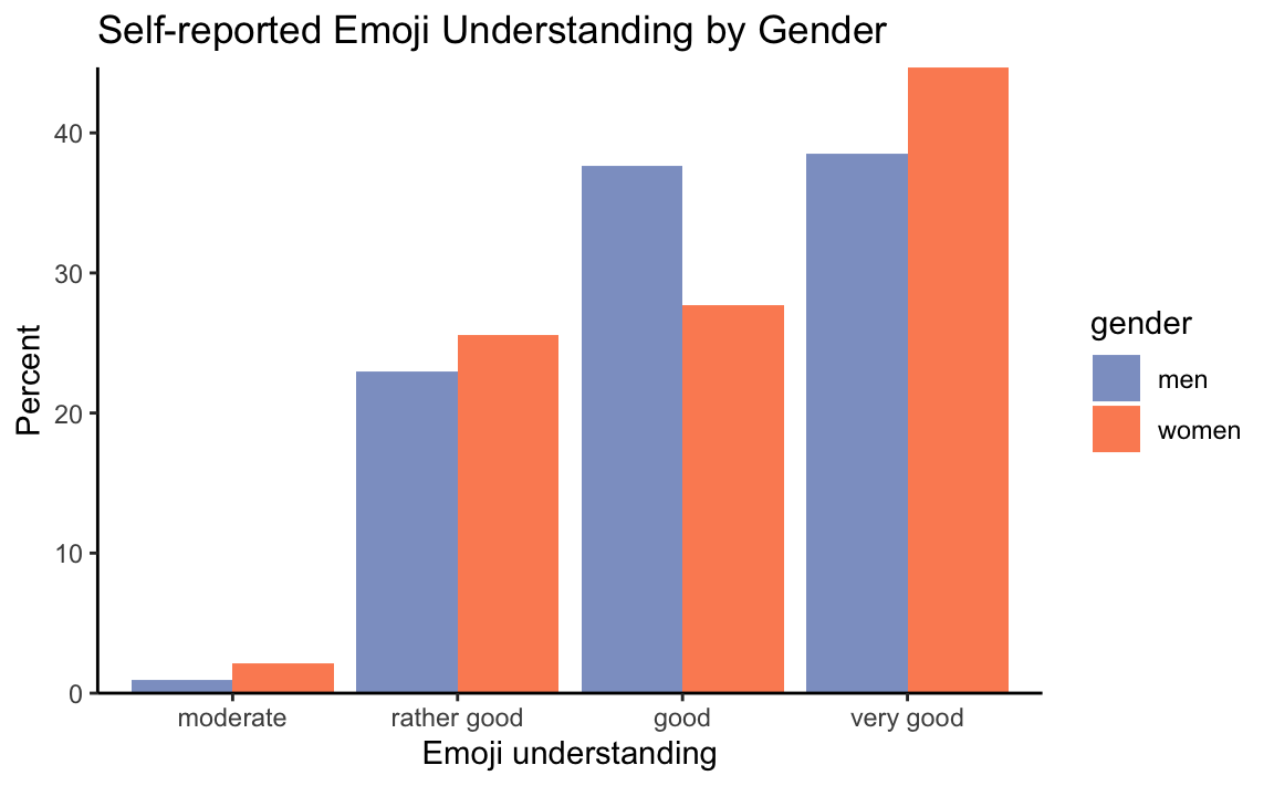This chapter’s analysis revealed gender-specific differences in emoji understanding, potentially indicating a gender confidence gap between men and women. On average, however, both genders reported at least a good understanding of emojis. The visualisations have been adjusted for the gender imbalance in the data, demonstrating the importance of accounting for differences in group sizes.