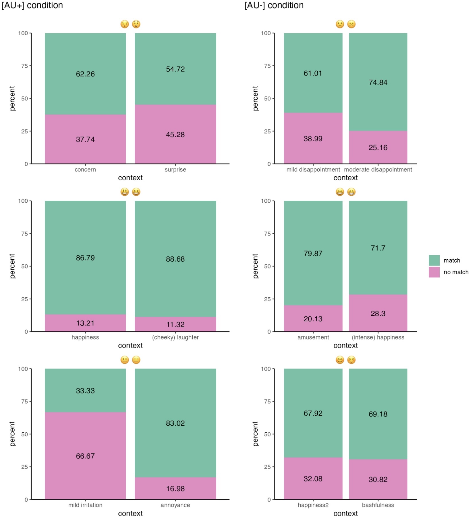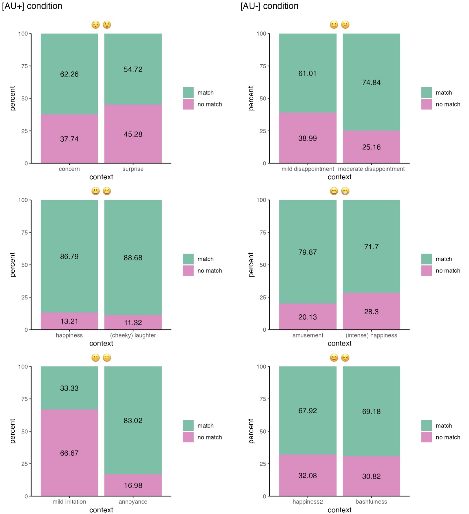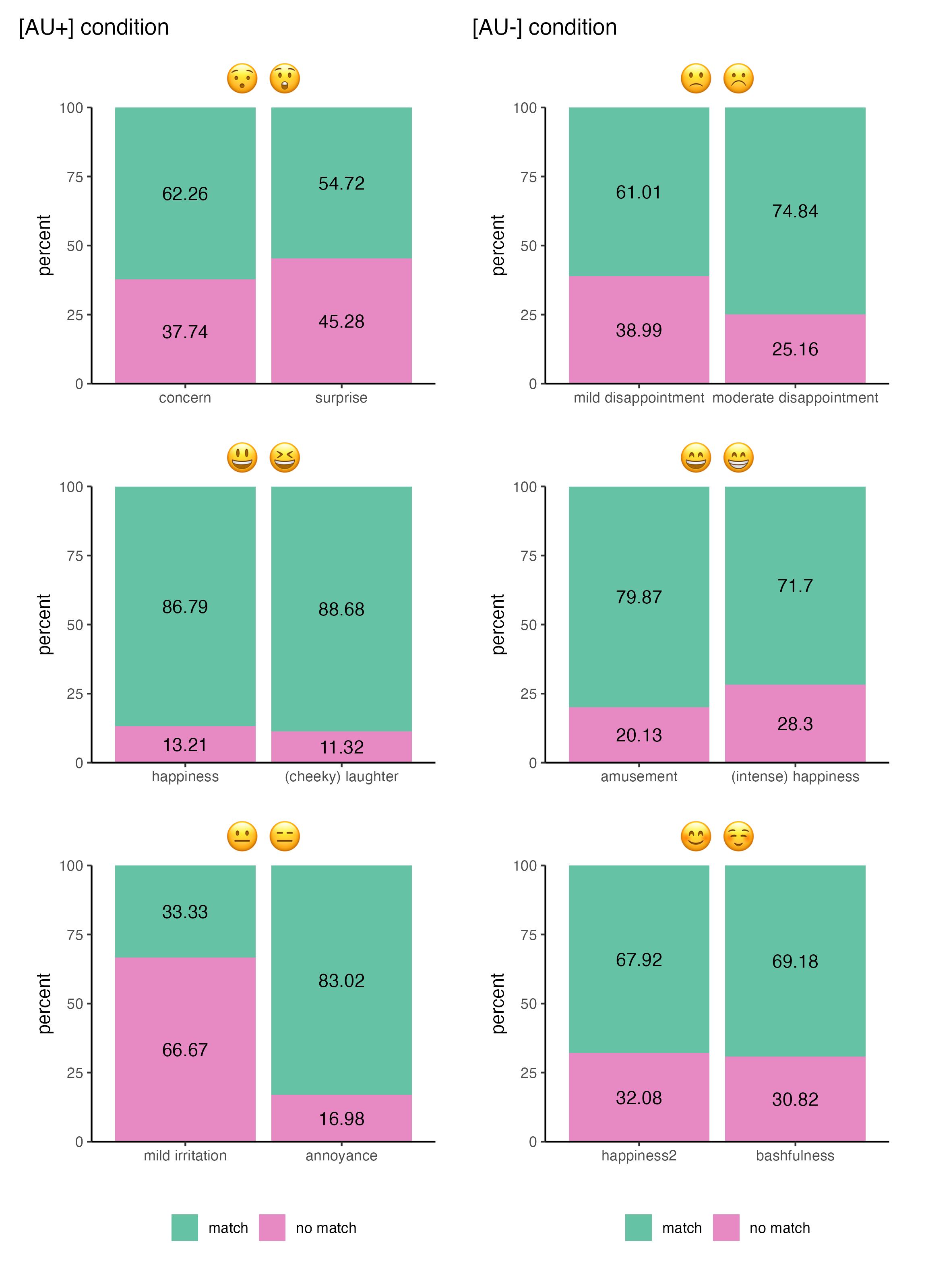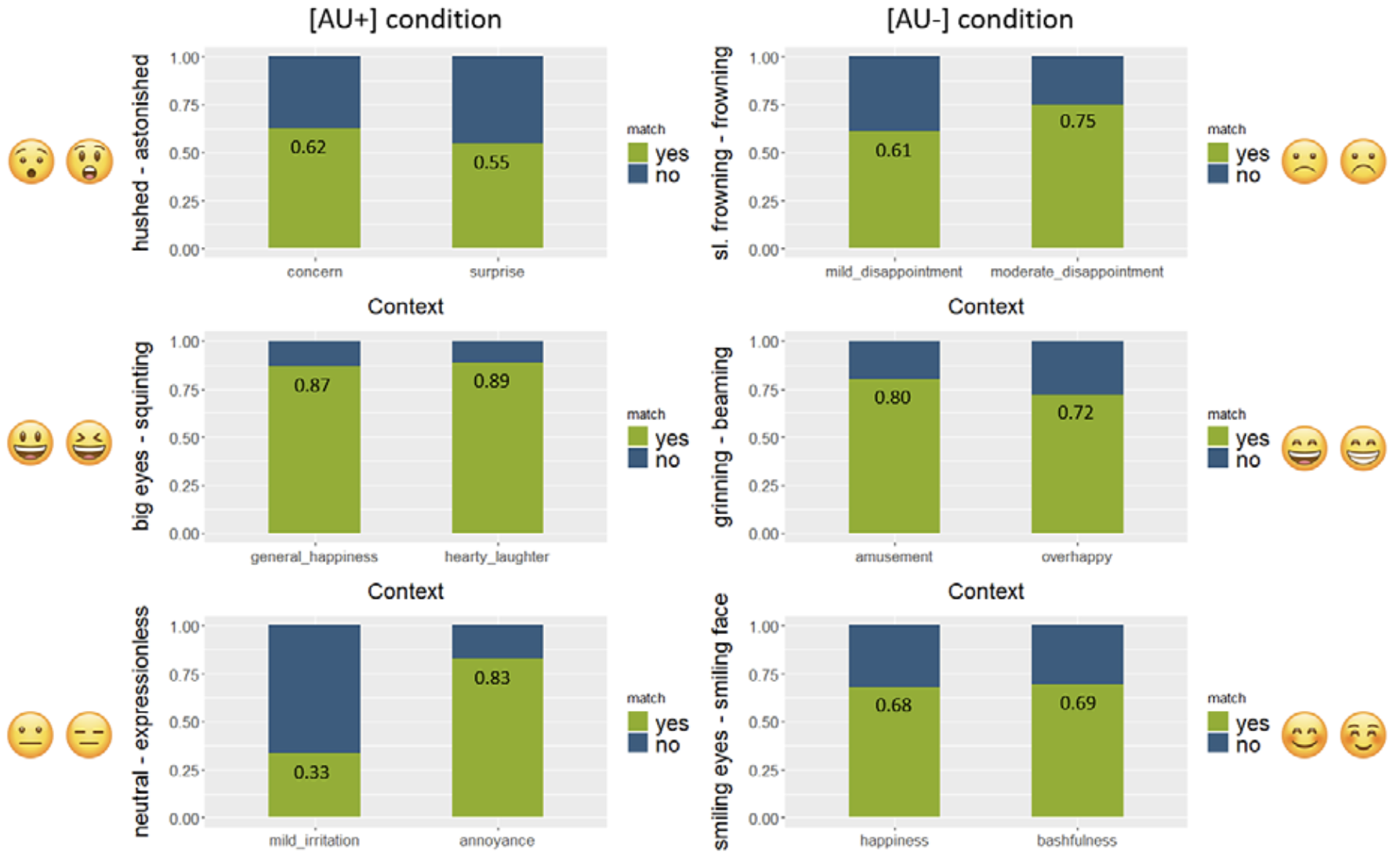 Overall, Figure 17.9 shows that there was indeed a preference for context-matching emojis. Importantly, participants preferred the context-matching emoji in both the AU+ condition and the AU- condition: The overall matching rate of AU- pairs is very similar to that of AU+ pairs. This means that whether or not emoji features coincided with human facial features did not (significantly) affect the participants’ decision for one emoji or the other.