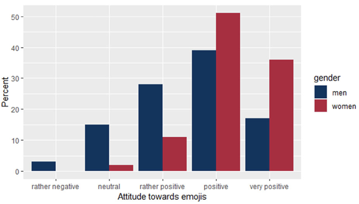 Fricke, Grosz & Scheffler (2024) asked participants about their gender, their attitude towards emojis, how often they use emojis on WhatsApp and how well they think they understand emojis. The authors visualised the distribution of men and women for emoji use and emoji attitude as barplots.