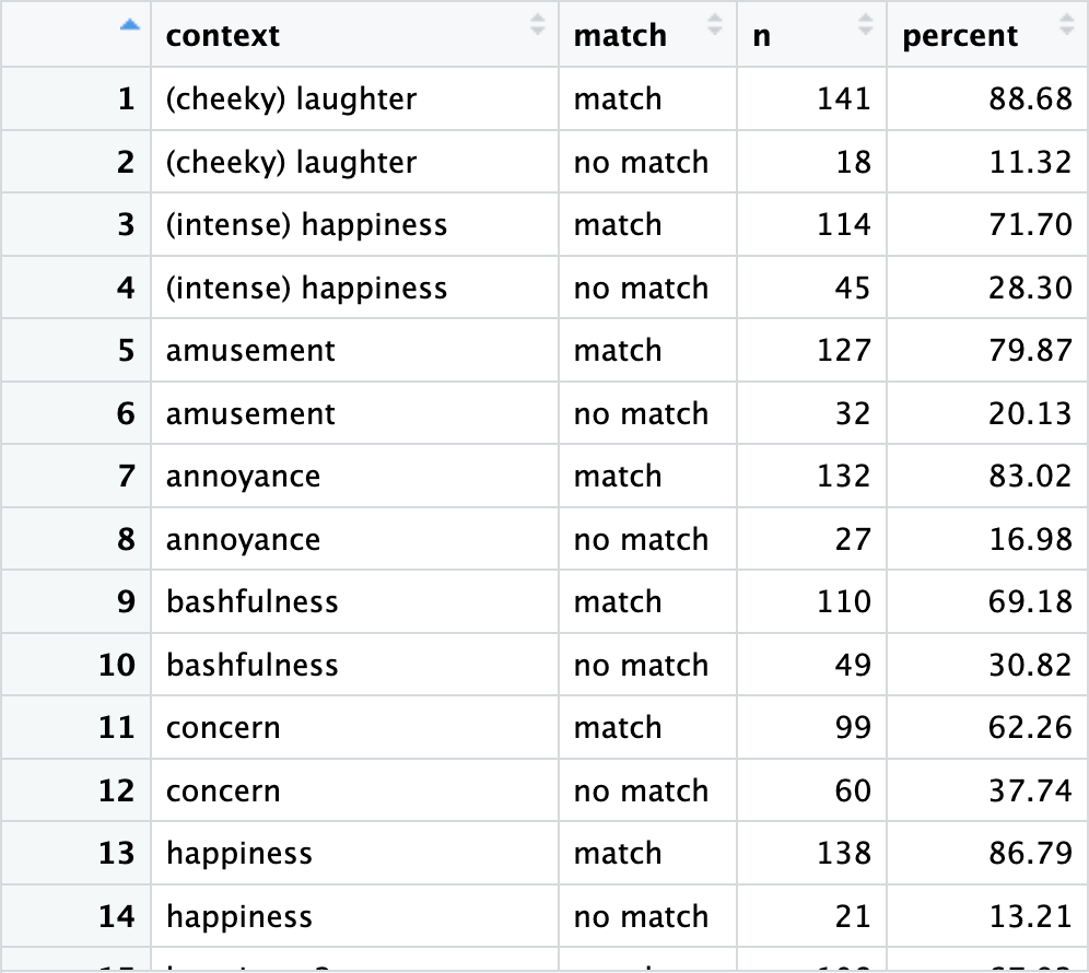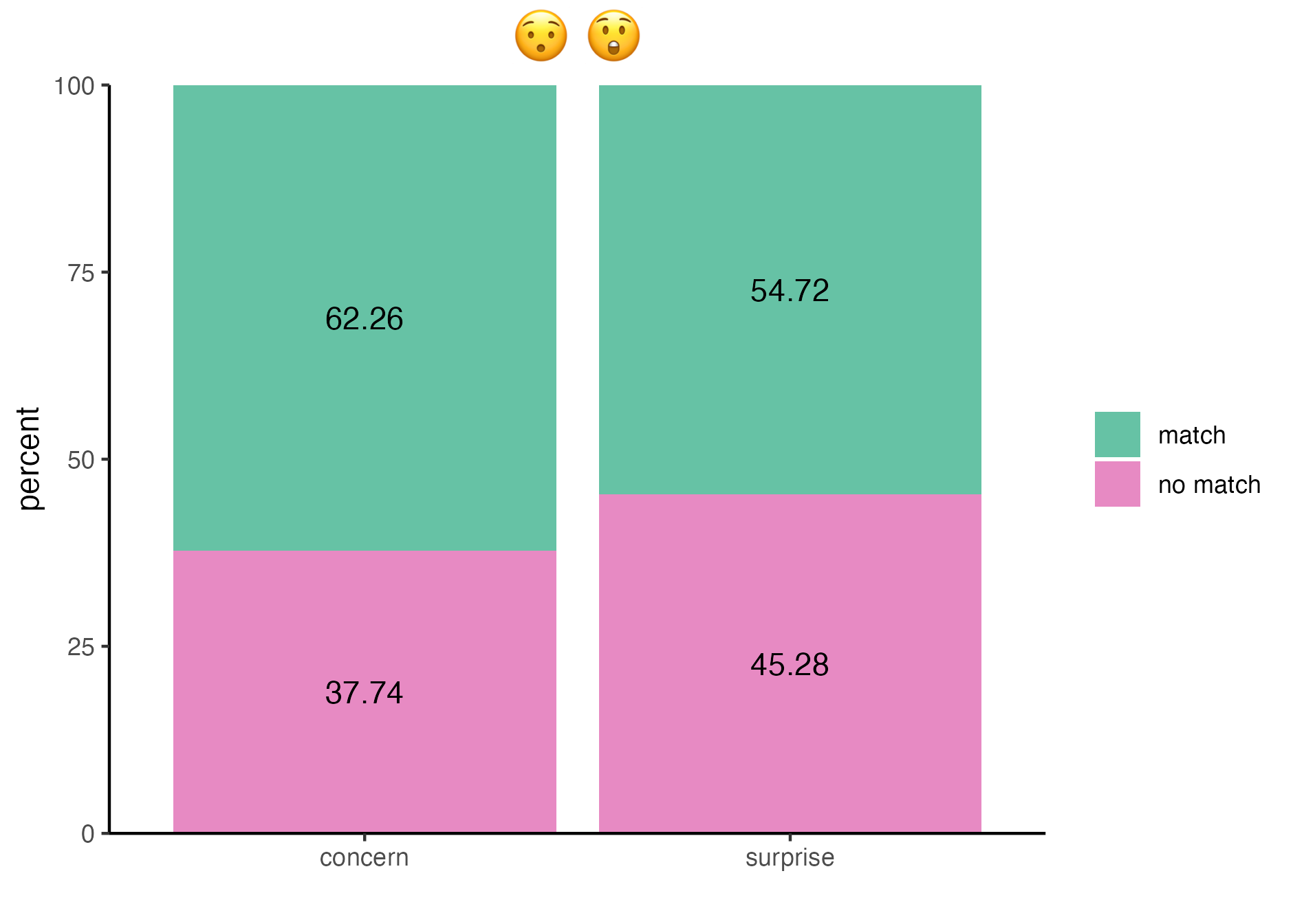 No, not at all! We can still draw some interesting inferences from the plot we created. For example, we see that minor visual differences between emojis do appear to affect the understanding and selection of emojis in different contexts: By slightly varying the contexts, participants were made to choose emojis with different facial features. Matching rates were quite similar within emoji pairs and, notably, also largely consistent across emoji pairs, regardless of their AU status. Hence, there is much more to explore in future linguistics studies on the semantics of emoji in text messages!