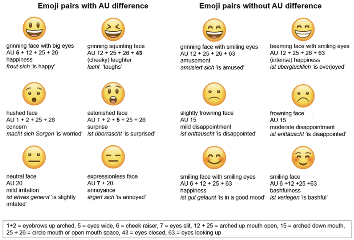 Fricke, Grosz & Scheffler (2024) defined two different types of emoji pairs: In the AU+ condition, the pairs of emojis are similar, but are assigned a different set of AUs. The emoji pairs in the AU- condition are also similar, but their AUs are identical. Fricke, Grosz & Scheffler (2024) deliberately selected emoji pairs that were as visually similar as possible to each other, while ensuring that the two emojis either differed by exactly one Action Unit (AU+) or had no differences in Action Units (AU-).