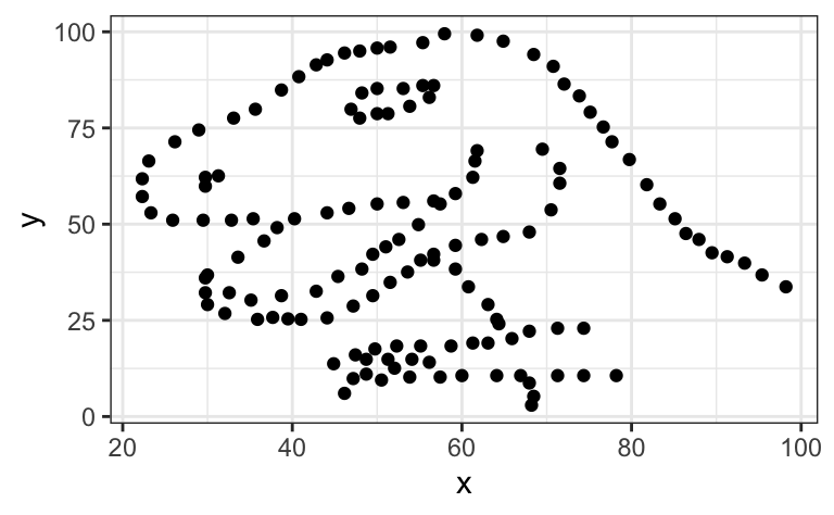 y = NULL) Clearly, if we had only used correlation statistics to describe the relationships between these 13 pairs of variables, we would have missed some literally dinosaur-sized patterns! 🤯
