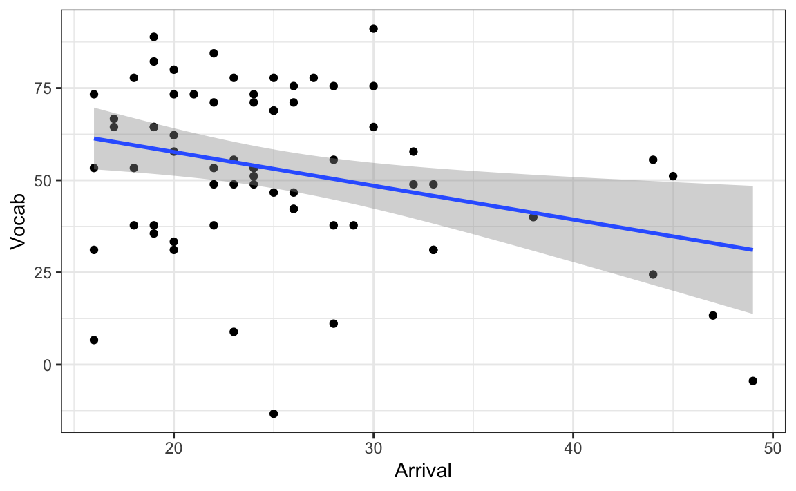 data = L2.data)Consider the code and its output below. Figure 1 visualises the correlation between L2 speakers’ English receptive vocabulary test scores (Vocab) and their age of arrival in the UK (Arrival).